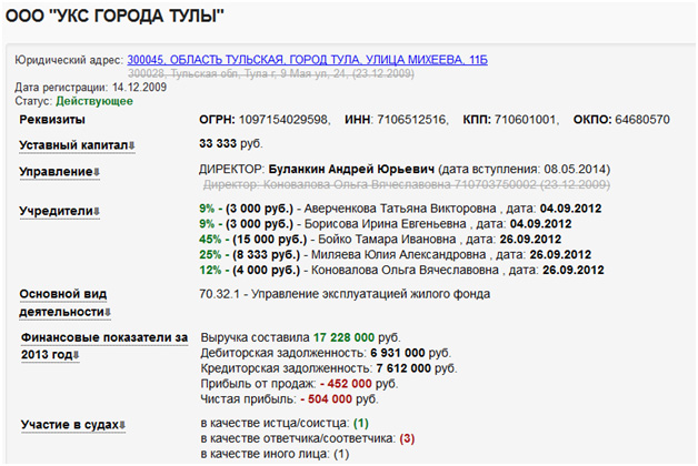 Интересно, что во время разбирательств ООО «Управление капитальными строениями города Тулы» (ООО «УКС») покинул директор, Роман Новиков. Он пытался нас стращать поначалу, но в результате сам испугался и сбежал. Сейчас в его кресле сидит Андрей Буланкин. Он же возглавляет и ООО ЖЭК «Тульский дом», инженер и специалисты у этих «укашек» одни и те же.