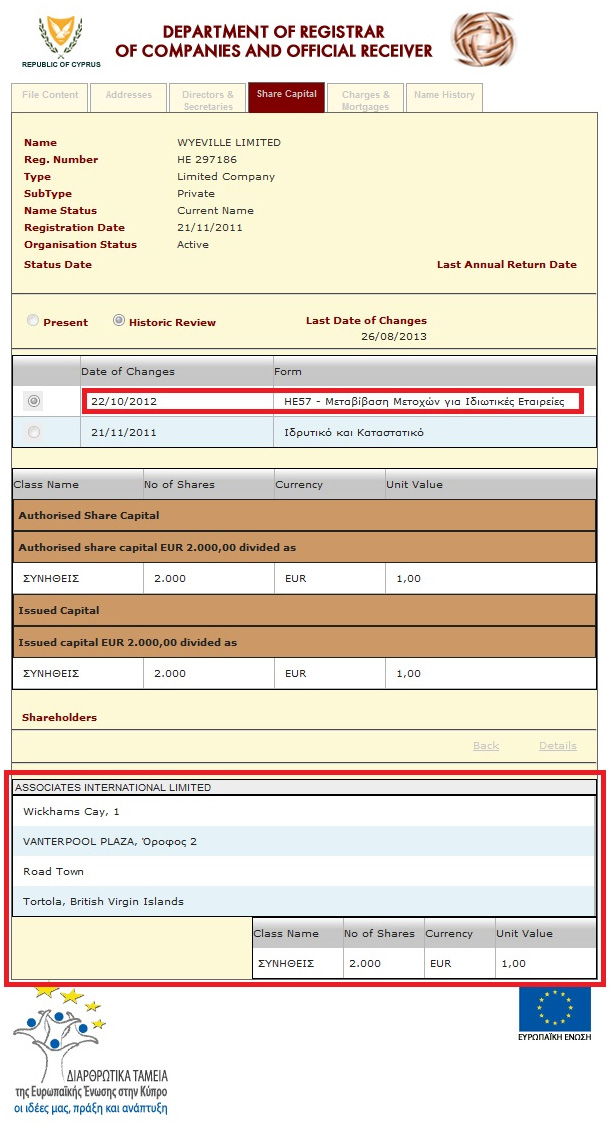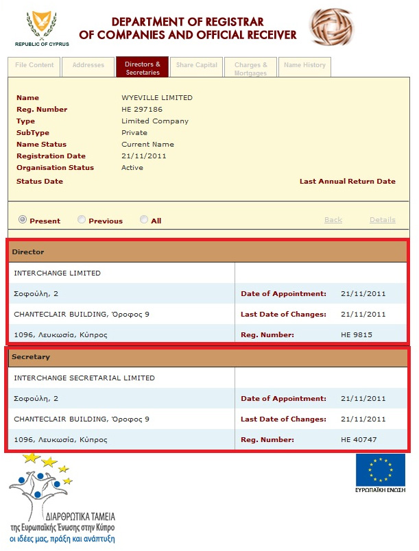 Для начала о тех, кто руководит кипрской инвестиционной компанией WYEVILLE LIMITED (ВАЙВИЛЛ ЛИМИТЕД), зарегистрированной в столице Кипра Никосии по адресу: Sofouli, 2, CHANTECLAIR BUILDING, 9th floor, P.C. 1096.