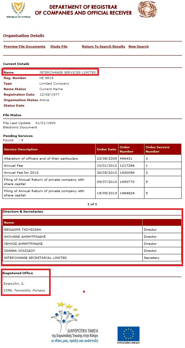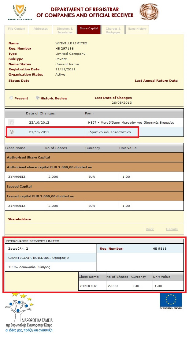 Это некая компания INTERCHANGE SERVICES LIMITED. Именно она выступила первоначальным учредителем WYEVILLE LIMITED (тех самых «Рогов и копыт»), которой фактически принадлежит тульский водоканал. Причём ДВЕ ТЫСЯЧИ ЕВРО (2.000 евро) в её уставной капитал так и не внесены.