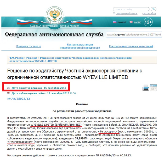 29 августа 2013 года у офшора, который в итоге и стал хозяином тульского «Водоканала», поменялись собственники :