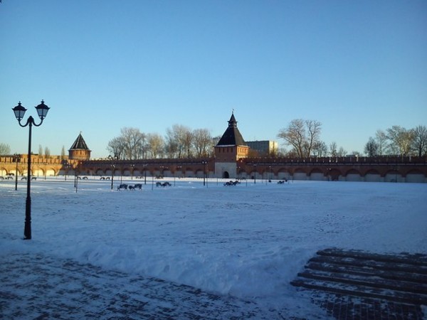 Свои мёрзнущие стопы мы направили в сторону Тульского кремля, слушая исторические справки Кости, который к нам уже присоединился. Тульский кремль — это довольно-таки древняя крепость, построенная в 1514-1520гг. В отличии от большинства крепостей он стоит не на холме, а в низине. И как мне было рассказано, этот кремль ни разу не был взят врагом.