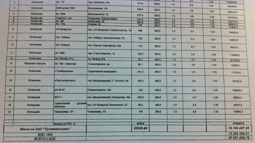 Ну, и на закуску информация наших читателей о ценах на аренду ЗАО «Тулатеплосеть» муниципального имущества. Извиняемся за качество снимка.