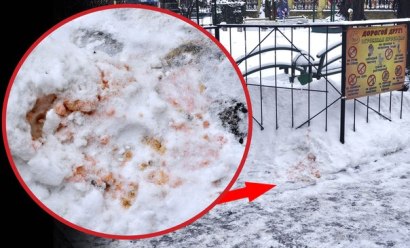 При реакции с ядом снег окрашивается в розовый цвет. Внимание, жители Заречья, фото сделано около Тульского экзотариума.