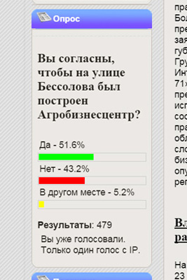 Вопрос, на который предлагается ответить посетителям сайта, сформулирован так, чтобы получить в итоге нужный покровителям «районки» результат. А именно, сам вопрос: «Вы согласны, чтобы на улице Бессолова был построен Агробизнесцентр?» — ни слова про сквер и вообще про место строительства (см. скан в левом верхнем углу).