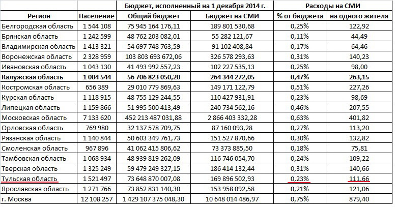 Как можно убедиться, меньше тульских на свой пиар тратят власти Тамбовской, Смоленской, Курской, Ивановской, Владимирской и особенно Брянской областей (Это если в расчете на одного жителя). Остальные гораздо активнее лезут в карман граждан, чтобы раструбить о своих заслугах. Особенно выделяются в этом смысле не самые богатые калужане. Впрочем, это пусть волнует тамошнее население. Хотя надо признать, что почти 170 миллионов «тульских» рублей в год — не такие уж маленькие деньги.