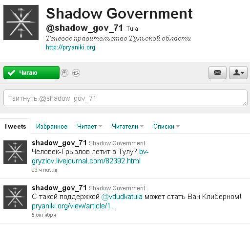 С самого начала мы думали, что эта, на наш взгляд, красивая идея не найдет поддержки читателей. Так оно в целом и получилось. Однако на днях в Сети появился Твиттер shadow_gov_71  Теневого правительства Тульской области, к которому мы отношения не имеем, но поддерживаем идею.