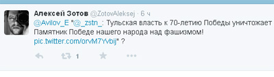 Уважаемые товарищи. В вашем тексте допущена ошибка. Данный твит с фотографиями был открыто прислан мне Тамарой Жданкиной @_zstn_ Я же данный твит просто перепостил. Тамара Жданкина написала мне т.к. кажется заблокирована у Авилова и других представителей власти, зная моё не равнодушие к проблемам города именно через меня решила привлечь внимание общественности. Поправьте пожалуйста неточность.