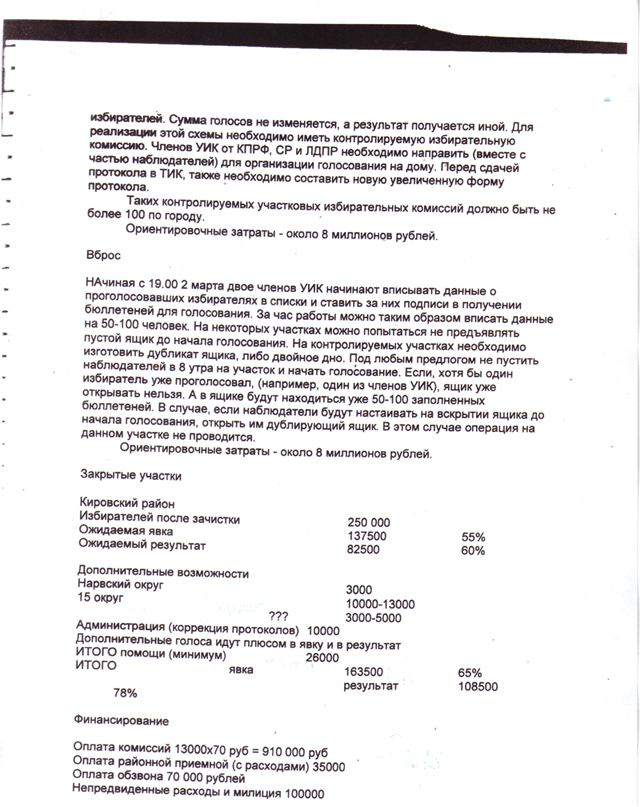 В мои руки попал очень интересный и показательный документ. Это внутренний документ петербургского штаба «Единой России». Мне достоверно известно, что он подготовлен для депутата ЗАКСа Санкт-Петербурга от «Единой России». Я сознательно не называю его фамилии. В документе четко описаны схемы, по которым проводилась фальсификация протоколов УИК и вброс голосов во время проведения выборов, а также расходы на их реализацию. Приводятся данные об ожидаемых результатах голосования, с учетом коррекции, по одному из районов Петербурга.