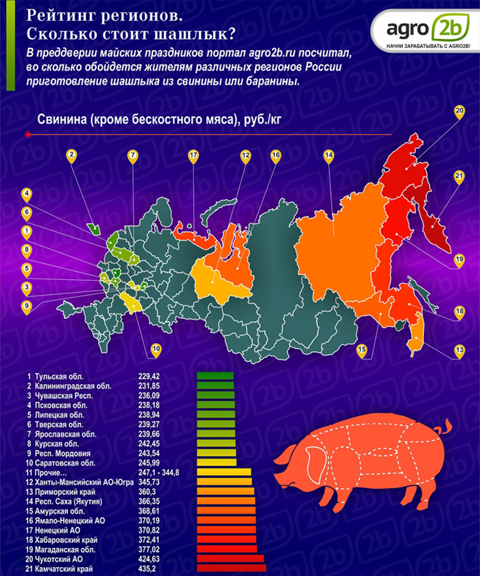 №1. Если хотите отведать вкусный, а главное – недорогой шашлык, добро пожаловать в Тульскую область! По сравнению с другими регионами, стоимость свинины здесь самая низкая – 229,42 рубля за килограмм. А вот любителям шашлыка из баранины придется раскошелиться на 373,97 рублей. Именно столько в регионе в среднем стоит килограмм мяса барашка…