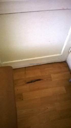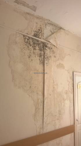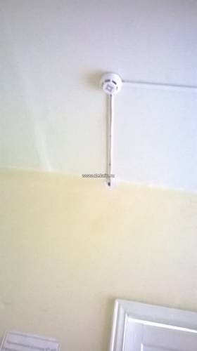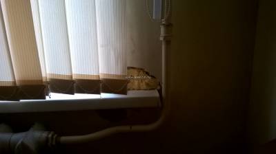 Обшарпанные стены, отбитая плитка на полу, свисающие не закрытые провода с потолка от проводки к датчику пожарной тревоги.