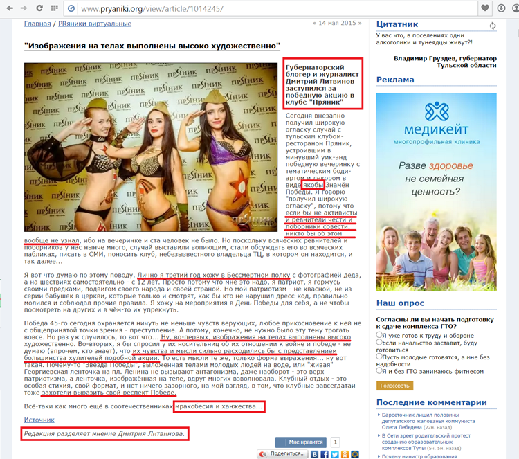 Для сомневающихся, что это не подстава курируемой коммиссаром «наших» редакции региональной интернет-помойки, тот же текст из ВК.
