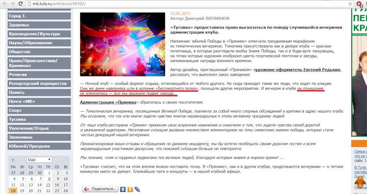 В приведенной выше цитате отчетливо проступает заместительная функция акции «Бессмертный полк», которую проединоросс от прессы использует как базис для отбеливания действий организаторов похабных проделок.