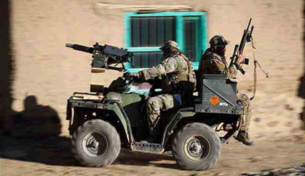 Квадроциклы сегодня состоят на вооружении подразделений США, Канады, Великобритании. Они используются, в частности, для проведения рейдовых мероприятий в пустынной местности. Самым популярным в вооруженных силах США и НАТО является квадроцикл Polaris MV700, отлично зарекомендовавший себя в Афганистане. Эта техника комплектуется креплениями для оружия и амуниции, есть дополнительная защита ходовой части и дуги безопасности. Для транспортных служб и обслуживания аэродромов закупается Polaris MV800 (модернизированная версия MV700), а для перевозки тяжелых грузов в труднопроходимой местности американские военные используют Polaris Sportsman 800 6×6, который перевозит до 400-от кг. В целом, номенклатура квадроциклов и техники на их базе, применяемой в иностранных армиях, весьма широка.