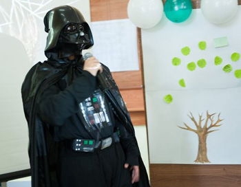 — Вообще наш институт проводит подобные акции не первый год, просто в этот раз у нас присутствует, если так можно выразиться, театральная компонента, — прокомментировала один из организаторов акции, первокурсница Юлия Сизова. — У нас задействованы два персонажа. Один из них, Дарт Вейдер, находится на теневой стороне. Он не осознаёт, что, сдавая макулатуру, мы бережём зелёные лёгкие нашей планеты. И потому даже пытается чинить препятствия. Но как только он поймёт, какое это полезное дело — сдавать макулатуру, и сам принесёт бумагу, то сразу же переходит на светлую сторону. И становится героем, спасающим наши деревья. Так что на светлой стороне оказывается каждый, кто проникается этой идеей. Непосредственно перед проведением акции мы провели большую работу: расклеили объявления на школах, жилых домах, оповестили другие институты ТулГУ. Через пять дней вся бумага, которую мы соберём, отправится на переработку. На вырученные средства мы купим саженцы сирени и посадим их перед 11-ым учебным корпусом. Облагородим нашу территорию! Для всех участников акции мы приготовили маленькие, но очень приятные подарки — семена цветов.
