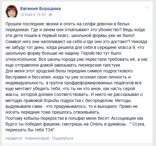 Живет в нашем городе некая Евгения Бородина, работающая главбухом известного салона «Тутанхамон» (на фото слева). Но славна она не этим, а тем, что в своем фейсбуке написала пост о том, что с детства не любила школьную форму: «Для меня этот уродский белый передник — символ подросткового бесправия и бессилия, когда ты уже осознал свою личность и индивидуальность, а группа профдеформированных педагогов все еще мечтает убедить тебя, что ты не что иное, как часть серой массы, которой должен соответствовать».
