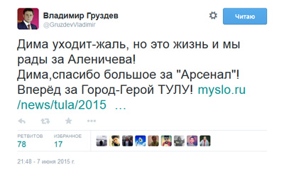 «Дима уходит — жаль, но это жизнь и мы рады за Аленичева! Дима, спасибо большое за «Арсенал»! Вперед за Город-Герой Тулу!»,— написал господин Груздев.