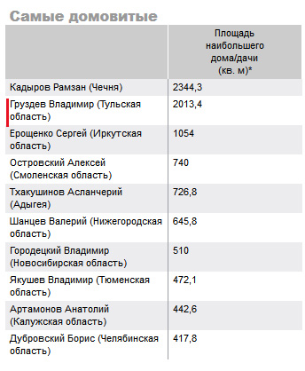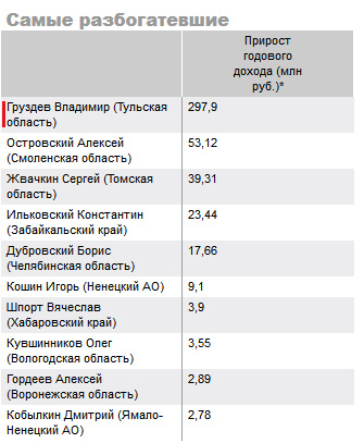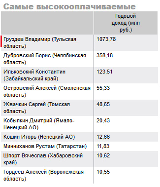 Четвертый год подряд самым высокооплачиваемым губернатором России становится глава Тульской области Владимир Груздев. В прошедшем году основатель сети «Седьмой континент», состояние которого журнал Forbes оценивает в $1,2 млрд, вновь преодолел отметку 1 млрд руб. дохода. В декларации господина Груздева отмечается, что доходы «по основному месту работы» составили 712,1 тыс. руб. Губернаторскую зарплату господин Груздев целиком пожертвовал Тульской православной классической гимназии. За прошедший год он показал рекордный рост доходов, увеличив свой заработок почти на 300 млн руб.