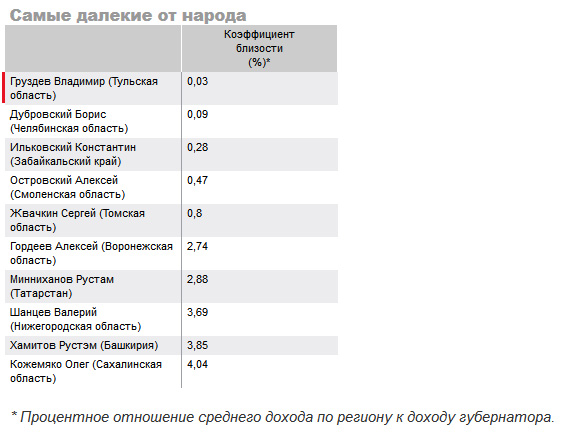 Традиционно самые богатые и самые бедные губернаторы оказываются в рейтингах по рассчитанному «Властью» коэффициенту близости к народу (процентному отношению среднего дохода по региону к доходу губернатора). Лидеры денежных списков Владимир Груздев и Рашид Темрезов возглавляют топ-10 соответственно самых далеких и близких к народу глав регионов. Среди самых близких губернаторов оказались новички Александр Козлов и Сергей Меняйло. Губернатор Чукотки Роман Копин почти вдвое увеличил доход и опустился с первой строчки на пятую. А среди далеких от народа губернаторов только главы Нижегородской области и Башкирии Валерий Шанцев и Рустэм Хамитов не входят в топ-10 самых высокооплачиваемых.