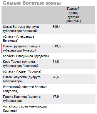 Супруги губернаторов не отстают от своих мужей, а некоторые и превосходят их по доходам. В топ-10 самых богатых жен восемь из них (за исключением Ольги Груздевой и Гульсины Миннихановой) заработали больше своих мужей. Госпожа Груздева при этом уступила первое место в рейтинге доходов супругов Ольге Богомаз, жене временно исполняющего обязанности губернатора Брянской области Александра Богомаза. Самый маленький доход за прошедший год задекларировала супруга главы Калмыкии Алексея Орлова — она заработала за год 43 тыс. руб. У пяти губернаторов из деклараций вообще пропали сведения о супругах.