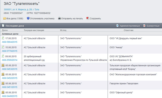Списки арбитражных дел ЗАО «Тулатеплосеть» и ОАО «Тулагорводоканал»