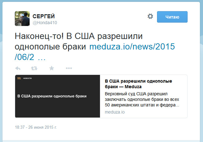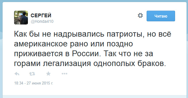 Радость и мечты тульского креакла Радостные новости для всех сторонников и разносчиков общечеловеческих ценностей пришли на этой неделе из США Все желающие могут разделить ликование и помечтать вместе с тульским твиттерянином @Honda410 КомментарииДобавить комментарий |