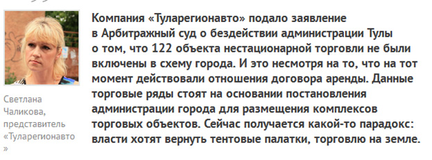 Как следует из той же статьи, представитель ООО «Туларегионавто» Чаликова, у которой предприниматели арендуют эти места, готова защищать попранные права малого бизнеса, не щадя живота своего…