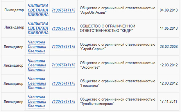 Вот только Светлана Павловна Чаликова, родившаяся 8 декабря 1976 года в поселке Трудовой Центрального района Тулы, хорошо известна областным налоговым и правоохранительным органам совсем не как кризисный менеджер. Ее специализация иная. Чаликова — заслуженный ликвидатор предприятий, ставших обузой для их прежних владельцев.