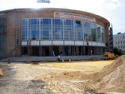 Но на данный момент площадь перед цирком огорожена забором — ремонт продолжается. Внутри помещение выглядит так, что с первого взгляда понятно, насколько далеко еще до финального этапа: в фойе штукатурят, готовят крепления для подвесных потолков и т. д. В зрительном зале вместо демонтированных старых кресел и напольного покрытия — лишь упаковки со строительными материалами. Но работа кипит…
