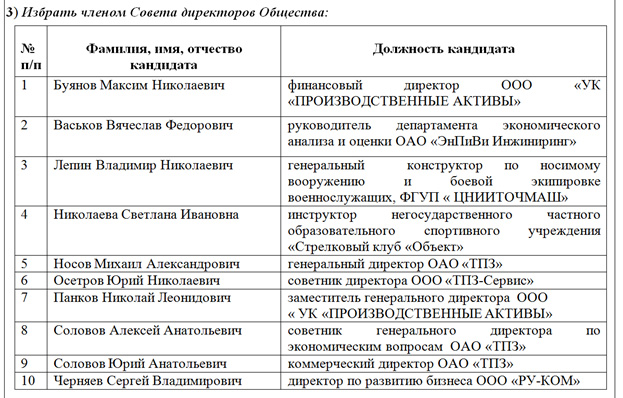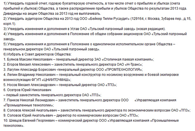 Если мы сравним состав Совета директоров ОАО «Тульский патронный завод» в 2014 и в 2015 году, то без сомнения обратим внимание, что он кардинально поменялся.
