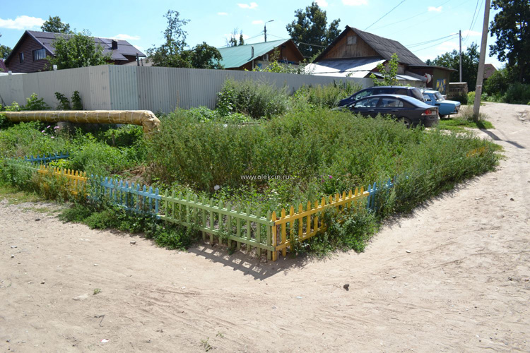 …Клумбу осенью 2014 поставили. На асфальт поставили забор из реечек, насыпали в середку кучу земли, не забыв при этом огородить часть надземной теплосети (при любом ремонте которой, от так называемой клумбы не осталось бы и следа, логика зашкаливает) оставалось только радоваться. Но вот прошел год, и что мы видим? Клумба есть, а цветами не пахнет. Никто из администрации не удосужился посадить ни единого цветочка, вместо них высокие непонятные сорняки в загаженной бродячими собаками и кошками земле.kl-03Фото внешнего вида клумбы. Сделано сегодня