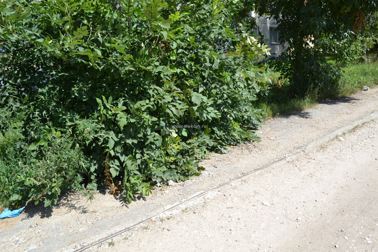 Тротуары, прилегающие все к тому же дому по ул. Санаторная,2 давно заросли сорняками, пробившимися сквозь толщу асфальта. Это полбеды. Пройти там можно только на четвереньках, или сильно пригнувшись, ведь никто не занимается опилом придворовых кустарников.kl-06Фото сделано сегодня. Тротуар сбоку дома Санаторная 2
