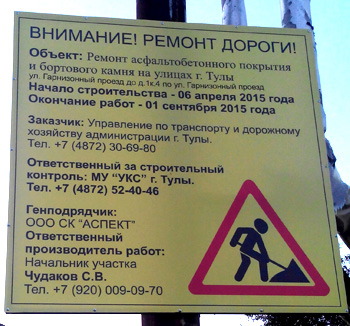 Не помню когда появилась эта табличка, скорее всего в день начала работ. Табличка появилась, а вот работников/ремонтников не появилось. (дорога она же сама себя чинит, зачем что-то делать).