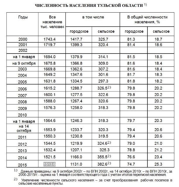 Как сообщается на сайте службы статистики, на 1 января 2015 года население Тульской области составляло 1 513 600 человек. По сравнению с 2014 годом численность жителей сократилась на 7900 человек.
