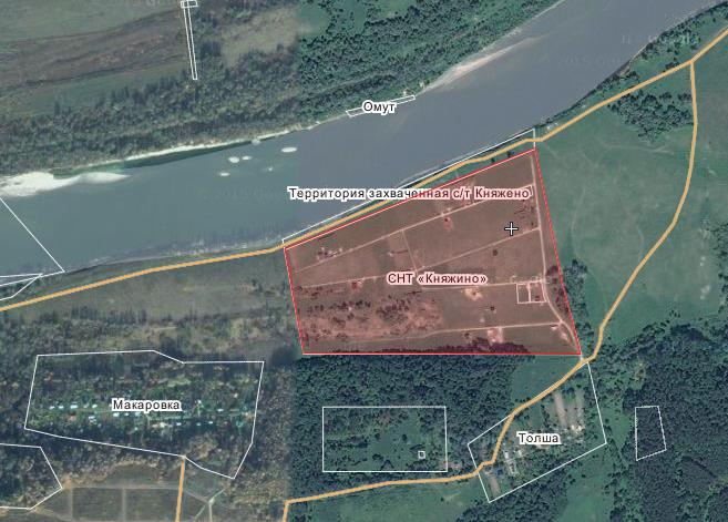 Для начала — спутниковый снимок для ориентации на местности:abr-03Запомните эту фразу «расположено в периодически затопляемой пойменной зоне», она вам еще встретится. И еще одну — «Территория захваченная СНТ «Княжино», эта земля —  береговая линия, которая по закону не может быть в частном владении.