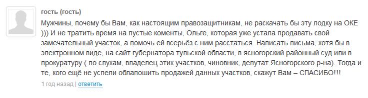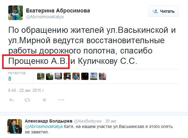В остальном господин Прощенко человек ну очень положительный, и, кстати, не менее обязательный:abr-23-pristavyИ это все явно помогает ему в участии в конкурсах на муниципальные заказы при горячей поддержке руководства Ясногорского района: abr-24-twiХотя у простых жителей мнение иное. Но кто они такие эти жители, против нерушимого антикоррупционного союза главы районной администрации и депутата?