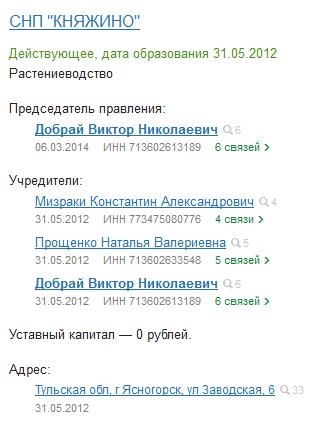 abr-13-knyazhino-1Более подробно — вот здесь: abr-14-knyazhino-2Регистрационные данные этого СНП:abr-15-knyazhino-snpНачнем с Добрая В.Н. Эта ссылка наглядно иллюстрирует отношения Виктора Николаевича с местной властью: abr-16-gazetaИнтересно, что руководство Иваньковского стали «мочить» в интернете буквально на следующий день после выхода вот этого Постановления, запретившего Добраю переводить сельхозземли в категорию «для индивидуального жилищного строительства».