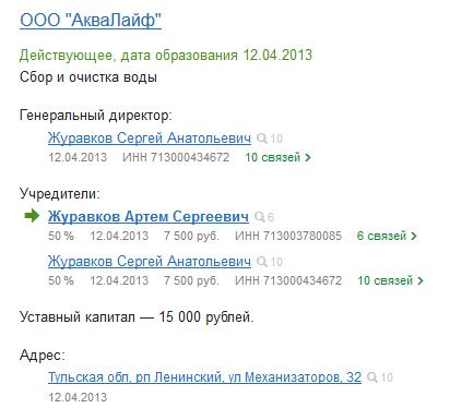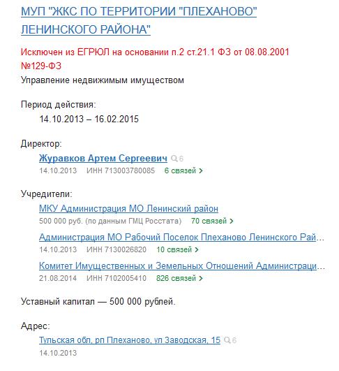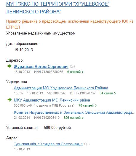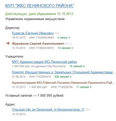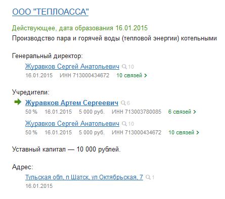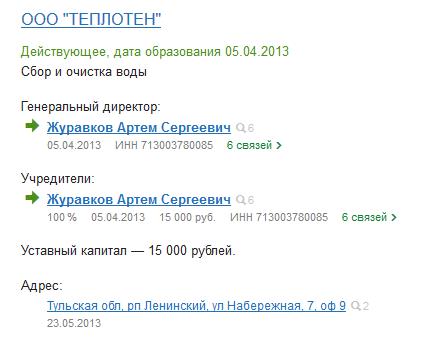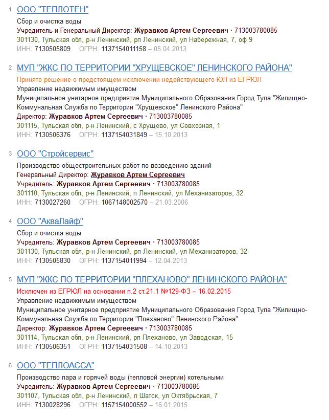 Начнем с ООО «ТеплоТен»:ab-01 ab-02Но на Артеме Сергеевиче «висит» не только эта фирмочка.ab-03Оказывается господин Журавков — бывший директор двух обанкротившихся МУПов, учрежденных администрацией Ленинского района:ab-04-zhks ab-05-zhks-hrushДа и сейчас его таланты востребованы местными властями — он работает главным инженером… МУП «ЖКС Ленинского района».ab-06-mupНесложно заметить, что Артем Сергеевич талантлив не только на службе муниципальному образованию, он еще и бизнесмен:ab-07-strojserv ab-08-akvaИ сфера его коммерческих интересов простирается за границы бывшего Ленинского района.ab-09-doghttp://tulatczn.tularegion.ru/presscenter/calendar-copy/2015/08/27/calendar-copy_8084.html
