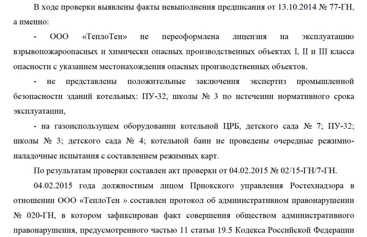 Теплоснабжающими организациями Ясногорского района ООО «ТеплоТен» и ООО «РГК-Тула» не приняты меры к устранению нарушений требований законодательства в сфере промышленной безопасности опасных производственных объектов. На котельных Ясногорска и Ясногорского района не проведены испытания и наладка тепловых сетей, замена ветхих тепловых сетей и запорной арматуры. Такие грубые недочеты, по мнению прокурора, могут повлечь за собой аварию, и, как следствие, — отсутствие отопления жилых домов.