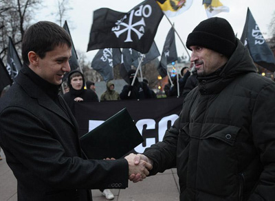 Максим Мищенко скорее блогерского, чем футбольного происхождения. «Россию молодую» он возглавил в 2005 году, сразу после ее создания. В декабре 2007 года Мищенко становится депутатом Государственной думы. Из переписки Горячева следует, что Мищенко очень помогает в борьбе: «Мищенко обещал запрос сделать депутатский, 4000 долларов» (депутат Мищенко действительно делал запрос в следственные органы о том, как идет расследование убийства школьницы Анны Бешновой; в качестве «симметричного ответа» на это убийство члены БОРН отрезали голову случайному гастарбайтеру Салохиддину Азизову, подбросив останки к управе Можайского района, — впрочем, утверждать, что имел место финансовый интерес, не беремся. Сам Мищенко факт мотивированных запросов отрицает). Также депутат Мищенко оставлял свои депутатские благодарности различным бизнес-компаниям, помогавшим, видимо, правому движению, — одна из таких фирм, например, зарегистрирована на Леонида Симунина.