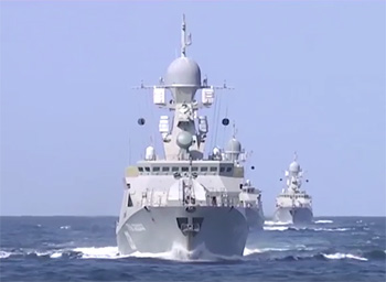 Сегодня [7 октября] ночью корабельная ударная группа (КУГ) ВМФ России в составе ракетного корабля «Дагестан», малых ракетных кораблей «Град Свияжск», «Углич», «Великий Устюг», нанесла удар крылатыми ракетами из назначенного района акватории Каспийского моря по объектам инфраструктуры ИГИЛ на территории Сирии.