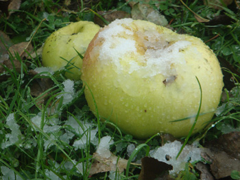 Яблоки надо было убрать до заморозков — иначе, они испортятся. Правда, антоновка менее всего подвержена порче из-за первого снега и ночных заморозков. У меня в детстве был друг Колька, не знаю жив ли сейчас или нет. Он ездил осенью, на ноябрьские праздники в деревню, к бабке. Там был сад с антоновкой. Колька любил сорвать с антоновской яблони яблочко, которое было прозрачным из-за заморозков. Всегда удивлялся тому, что яблочная антоновская кислота уходила. Яблоко было сладким, по его словам. Но на мой вкус антоновка и после заморозков всегда была кислятиной и жестка, как дерево. Другое дело — мельба. После сбора может лежать месяц и всегда сладкое яблоко будет мягким и сочным.