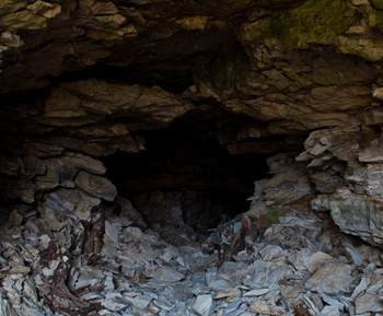 Уже в двух метрах от входа виден обвал породы — внутрь не зайти: