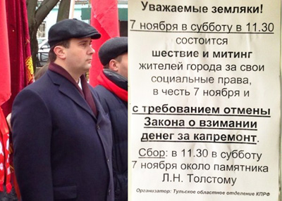 Дальнейший текст объявления добавляет явной предвыборной актуальности предстоящей акции в знакомой нам лебедевской логике проведения избирательных кампаний: 7 ноября Тульский обком КПРФ будет требовать «отмены Закона о взимании денег за капремонт». Что с политологической точки зрения, может быть, и перспективно, так как «7 ноября» сентябрьские выборы 2016 года не выиграть, хотя с моральной точки зрения мешать годовщину ключевого события ХХ века с дешёвым, запоздалым политическим пиаром просто позорно. Позорно это и с той точки зрения, что упомянутую плату за капремонт вся Тульская область платит уже год, но, по-видимому, такой «вкусный» для политиков повод поднарастить свой электорат приходилось беречь под самые выборы, не растрачивая его по пустякам.