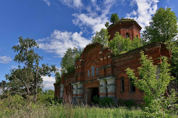 И тут нам повезло — поднявшись в горку, перед нами открылся прекрасный (для любителей заброшенного, конечно) вид церковных руин, утопающих в зелени. Храм по своим формам, бесспорно, лишён изящества и весьма громоздкий. Но нарочито массивные архитектурные формы (особенно мощные белокаменные полуколонны), определённо, выделяют его из массы простых красно-кирпичных сельских храмов, придавая тем самым свою уникальность.