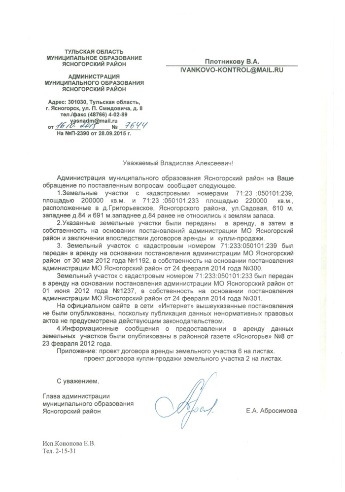 Копия письма администрации МО Ясногорский район №7644 от 16.10.2015