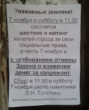 7 ноября я ехал по проспекту Ленина в Туле в маршрутке вверх от площади Ленина. Но ленинцы не дали мне доехать до нужной остановки. На Пушкинской поперек проезжей части стояли два гаишника, разгонявшие все транспортные средства на второстепенные улицы. Джамшут за рулем сообщил: «Проспекта закрыта, демонстрация»…