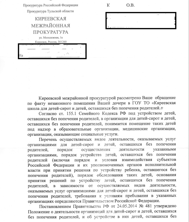 Представляем ответ Прокуратуры на заявление родителей о незаконном изъятии своего ребенка. Пока считаем необходимым скрыть имена родителей и ребенка, чтобы они не стали жертвами ток-шоу, которые научились уже даже обманывать и завлекать будто бы желанием помочь: