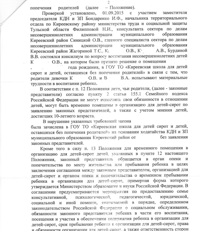 Странно, что Прокуратура ничего странного в этом не нашла, а наоборот, подкрепила это статьей из Семейного кодекса РФ п.2 ст.155.1, что, мол, если родители не исполнять свои обязанности, то дети помещаются в соцприют. Новая трактовка этой статьи?