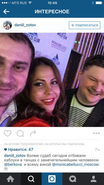 После чего Зотов-младший выложил в социальной сети фото с порнодивой и припиской: «Волею судеб сегодня отбивали каблуки в танцах с замечательным человеком @berkova и всему виной @monikabellucci_moscow!!!»