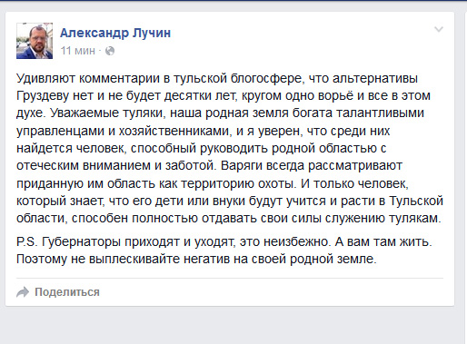 Удивляют комментарии в тульской блогосфере, что альтернативы Груздеву нет и не будет десятки лет, кругом одно ворьё и все в этом духе. Уважаемые туляки, наша родная земля богата талантливыми управленцами и хозяйственниками, и я уверен, что среди них найдется человек, способный руководить родной областью с отеческим вниманием и заботой. Варяги всегда рассматривают приданную им область как территорию охоты. И только человек, который знает, что его дети или внуки будут учится и расти в Тульской области, способен полностью отдавать свои силы служению тулякам.